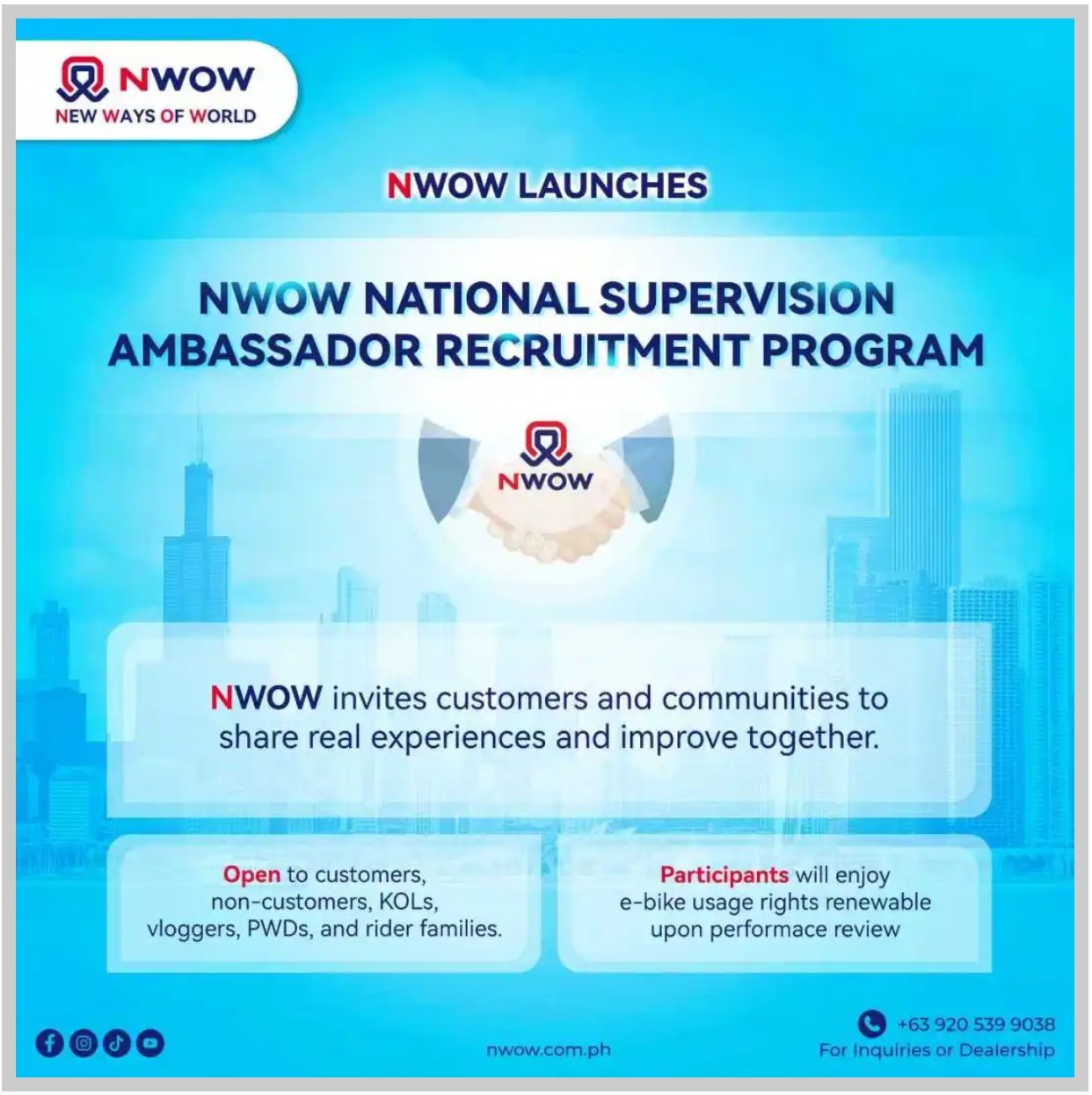 近日,NWOW品牌电动车在菲律宾成功举办“NWOW 15周年庆典”活动,与广大消费者和合作伙伴共同见证品牌十五年来的成长与发展。本次庆典特别邀请了NWOW品牌代言人——菲律宾知名明星夫妇 Dong Yan 出席现场,与观众亲切互动,吸引了众多顾客到场支持,星光熠熠,热闹非凡。